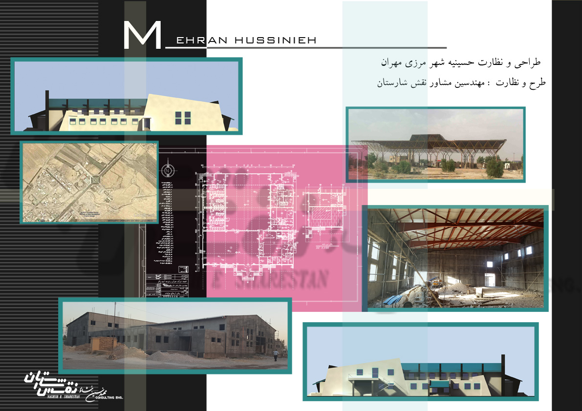 مهندسین مشاور نقش شارستان به کارفرمای شرکت امید زائر ( وابسته به سازمان حج و اوقاف ) مبادرت به طراحی حسینیه ای در شهر مرزی مهران برای سرویس دهی به زائران و مسافران حرم امام حسین و مراسم اربعین نموده است ، طرح به نحوی تهیه گردیده که حسینیه فوق قابلیت پذیرایی از زائرین و صرف غذا در فضای فوق را نیز داشته باشد و آشپزخانه صنعتی نیز برای حسینیه فوق در نظر گرفته شده است. حسینیه از دو سالن مجزای زنانه و مردانه برخوردار است و برای استراحت و اقامت چند ساعته و نیز فضاهایی مانند دوش و سرویس بهداشتی مناسب برخوردار است . حسینیه فوق دارای فضاهای جانبی مانند سوئیت اقامت متولی وامام جماعت و همچنین محل اقامت پرسنل آشپزخانه صنعتی می باشد . این حسینیه با سطح اشغال 2500 متر مربع و مجموع زیر بنای 3200 متر مربع واقع در شهر مرزی مهران طراحی شده در نمای این پروژه از رنگ های سفید و فیروزه ای جهت جلوه مذهبی بیشتر از قوسهای زیبای اسلیمی در طراحی پنجره ها استفاده شده است که بر زیبایی حجم و نمای ساختمان ، افزوده است .
