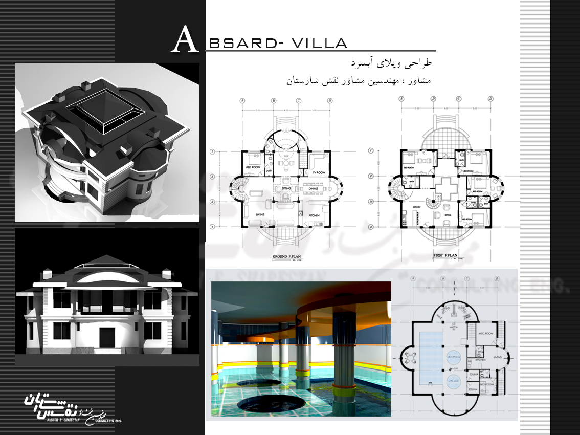 The villa has a square plan with an occupancy level of 242 square meters and a total infrastructure of 726 square meters with curved forms and suitable lighting in four directions with a sloping roof. The building is designed in three floors, two residential floors with a royal residence and a basement with swimming pool, sauna and Jacuzzi.