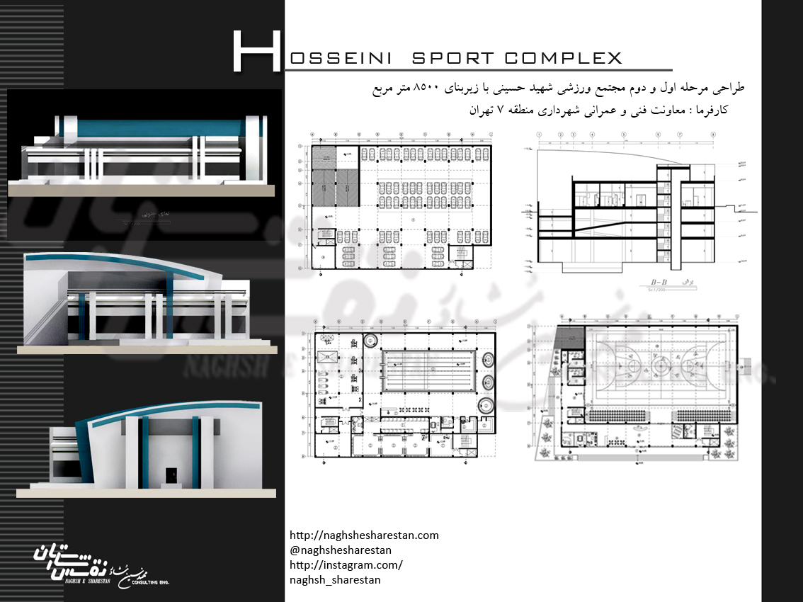This project was proposed to this consultant by the esteemed technical and civil deputy of Tehran Municipality, District 7. The land of the mentioned project was extracted from cleanliness and agreements made with the army, and the challenge ahead in this complex is to design a standard swimming pool with all aspects and parts of dry and wet saunas and gymnasiums on the 3rd floor and then construction of two floors of parking on the floors. 2- and 1-, in terms of arrangements so that the columns of the building do not cause disturbance to the pool bowl and the users, and most importantly, the design of the standard handball hall on the ground floor, which practically all internal columns should be ignored except the perimeter columns.