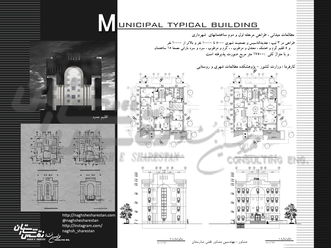 The Dehdari and Municipalities Organization, which is a subdivision of the Ministry of Interior, put the project of designing municipal buildings in cities with a population of 20,000 people in different climates on the agenda of Naghsh Sharestan Consulting Engineers. The problem arose because the Ministry of Interior provided a certain budget to cities that did not have a proper municipal building, and each city was required to build a municipal building with a certain budget, and in the end, some cities used the buildings. And some had progressed from 30 to 70.