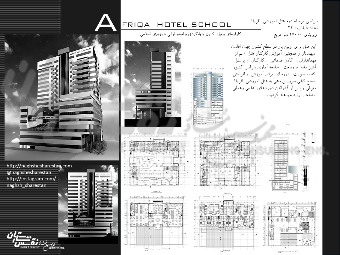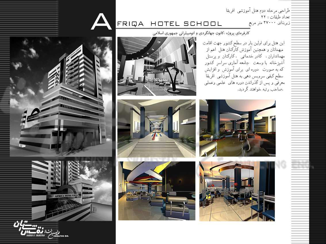 فاز دو پروژه هتل آموزشی افریقا واقع در تهران ، نبش مریم با زیر بنای 27000 متر مربع در دستور کار این مشاور قرار گرفت.