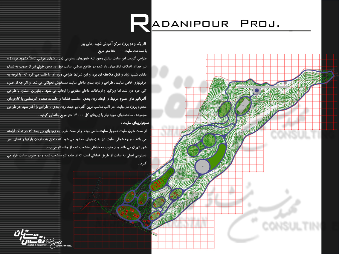 این پروژه با وسعت 580000 مترمربع در دستور کار مهندسین مشاور نقش شارستان قرار گرفت . این سایت جدا از وجود تپه ماهورهای سینوسی( در برشهای عرضی کاملا مشهود است)و اختلاف ارتفاع بوده و در مقاطع عرضی ، در محور طولی نیز از جنوب به شمال دارای شیب زیاد و قابل ملاحظه ای بود، و این شرایط طراحی ویژه ای را طلب می کرد که با توجه به توپوگرافی خاص سایت ، طراحی و زون بندی داخلی سایت دستخوش موضوعات پیچیده ای بود و اگر چه از اصول کلی خود دور نشد اما ویژگیها و ارتباطات داخلی متفاوتی را ایجاب می نمود . بنابراین مشاور با طراحی آلترناتیوهای متنوع و ایجاد زون بندی مناسب فضاها و جلسات متعدد کارشناسی با کارفرمای محترم ،در نهایت در قالب مناسب ترین آلترناتیو ، طراحی پروژه را به سرانجام رساند. این مجموعه از ساختمانهای اداری ، ورزشی ( استخر ، سالن فوتسال ، بسکتبال ) ، فرهنگی (آمفی تئاتر ، سالنهای همایش و مسجد ) ، خدماتی ، رفاهی و اقامتی برخوردار است .زیر بنای کل 24000مترمربع جانمایی گردید.
