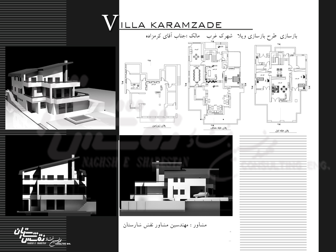 ویلایی در سه طبقه که در شیب قرار داشت، از طرف کوچه طبقه میانی، همکف محسوب می شد اما از طرف حیاط طبقه 1- با محوطه همسطح بود.