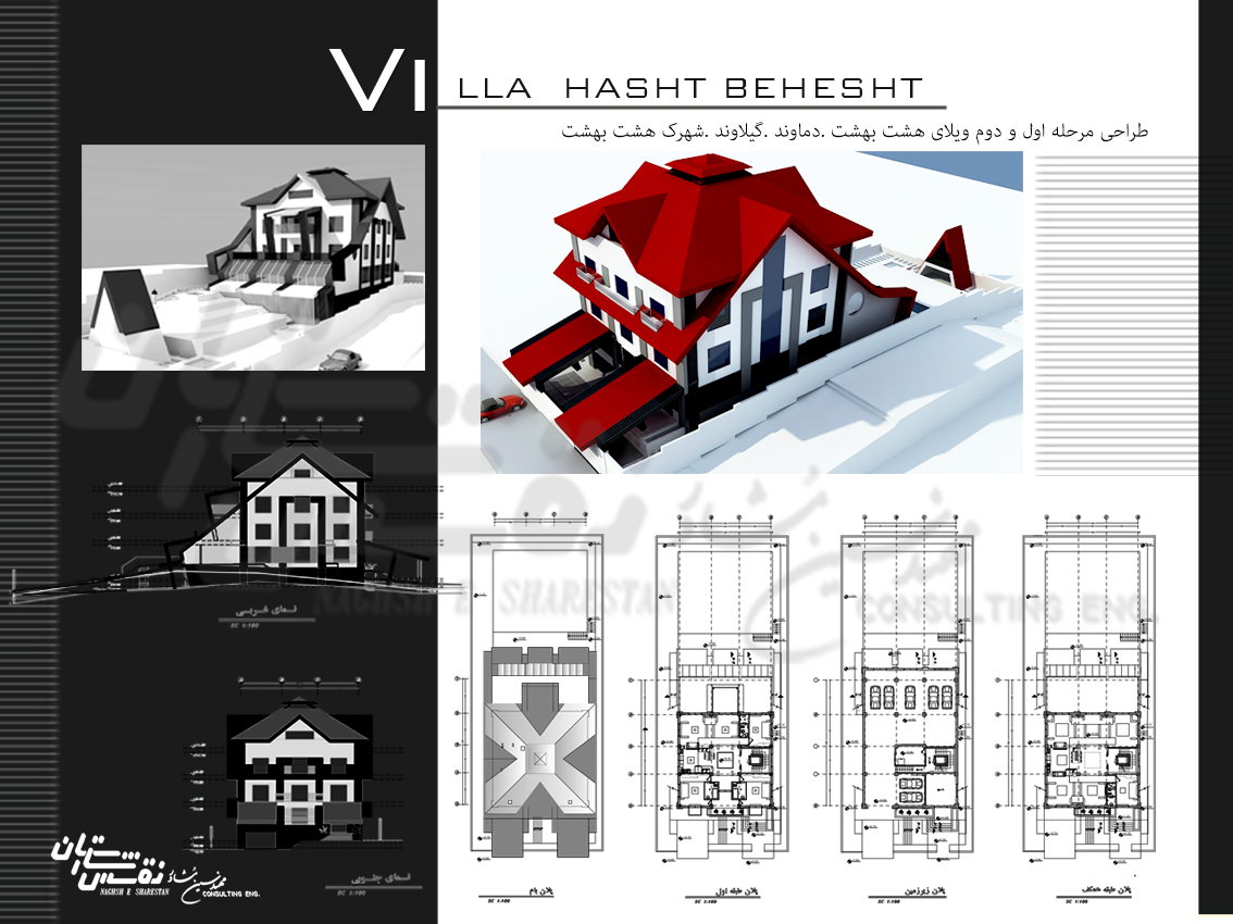 از طرف دیگر مهندسین مشاور نقش شارستان پیشنهاد شیب نسبتاً تند در شیروانی ویلا را مطرح نمود تا در صورت نیاز ، یک واحد آپارتمانی در محدوده زیر شیروانی نیز قابل اجرا باشد ( بعد از اخذ پایان کار )